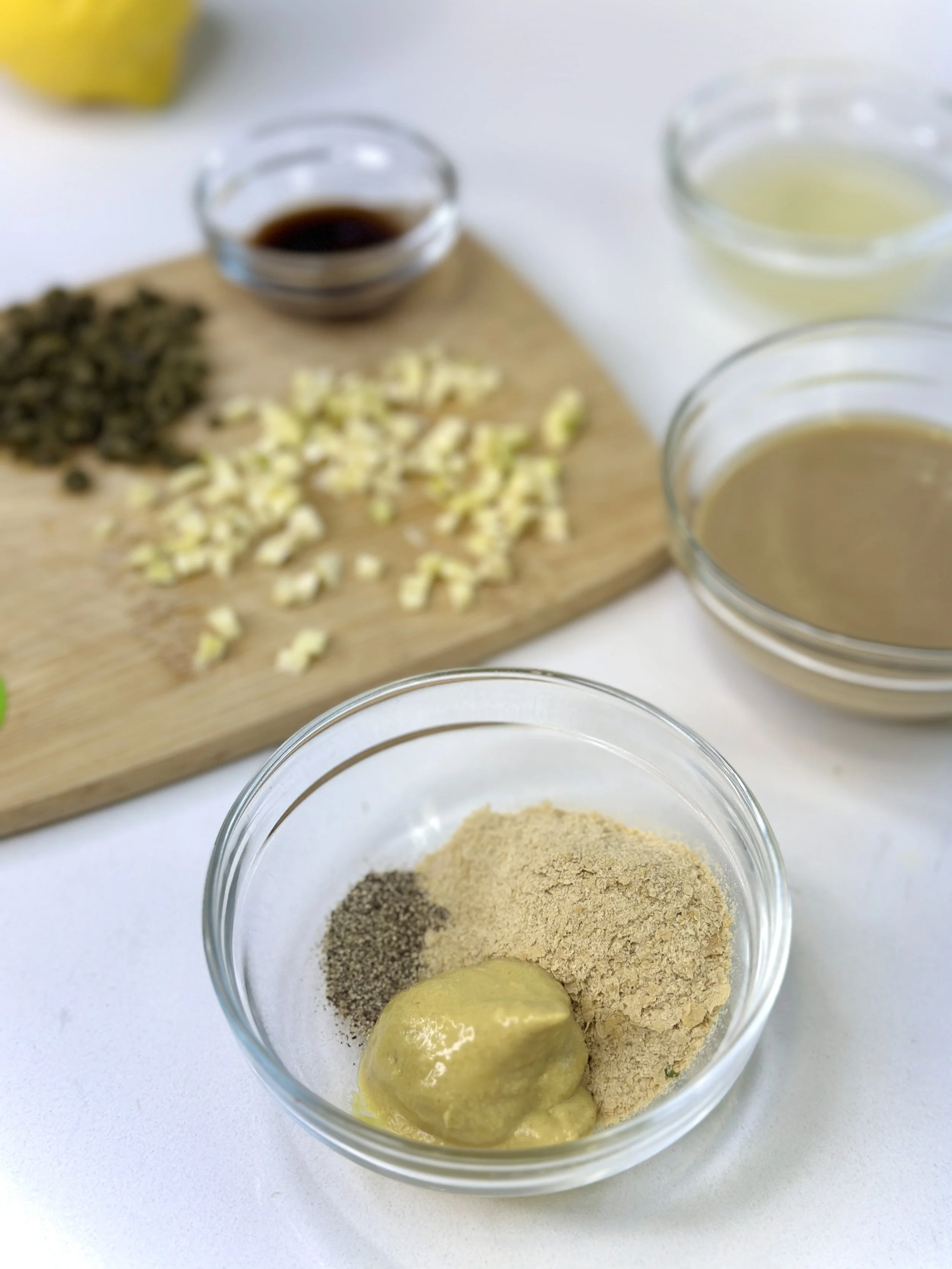 2. In a bowl, combine the tahini, nutritional yeast, lemon juice, Dijon mustard, minced garlic, chopped capers, soy sauce or liquid aminos and black pepper.