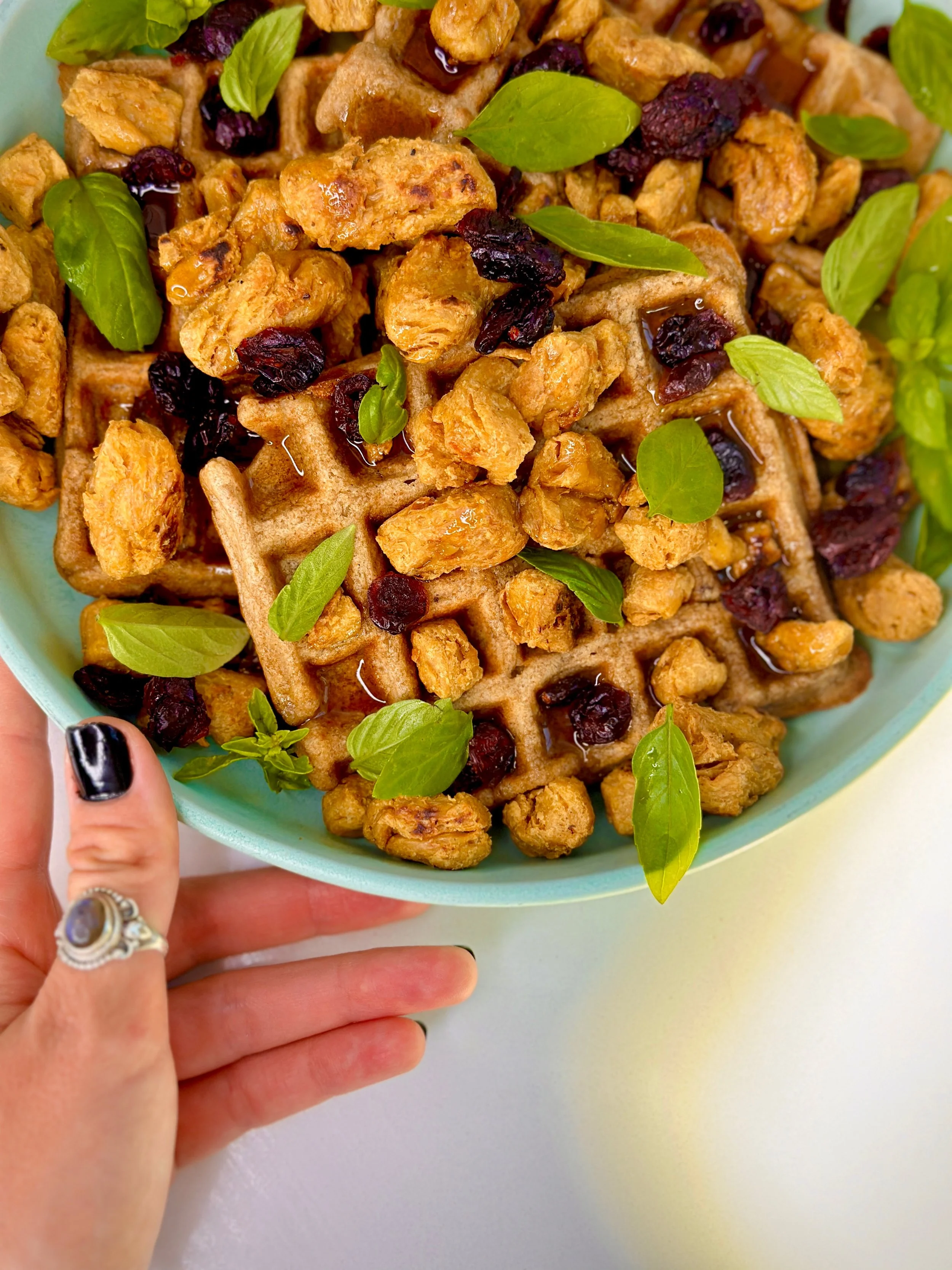 - Once the waffles are done, carefully remove them from the iron and serve them warm with the cooked vegan chicken. Add your choice of garnish; I drizzled mine with maple syrup, then topped with dried cranberries and fresh basil!