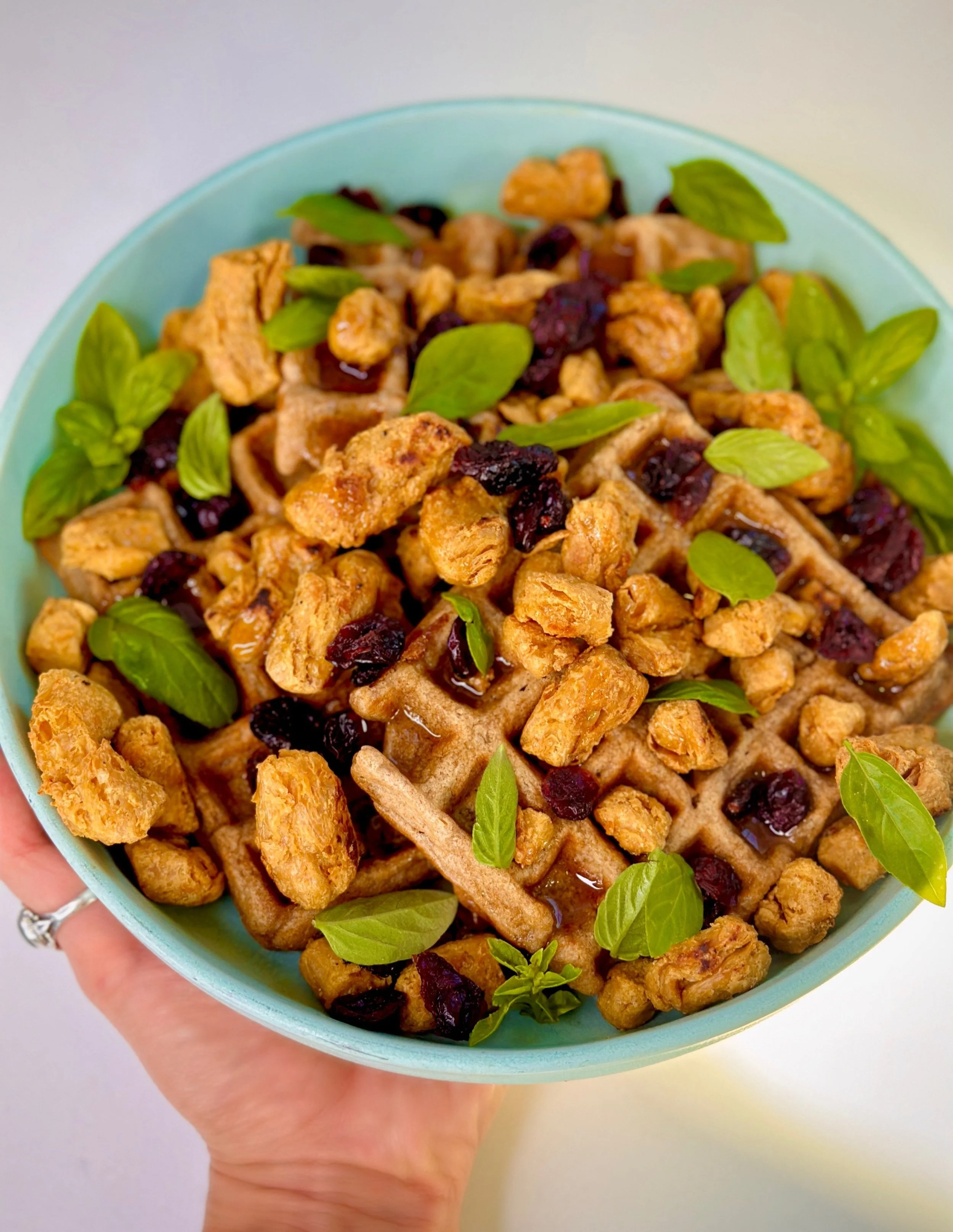 This waffle recipe uses plant-based milk in place of dairy milk, and can be made oil-free, as well, if you don’t use oil on your waffle iron. Whole wheat flour is used to give it added nutritional benefits like complex carbohydrates and fiber. You can use any kind of vegan chicken you would like for this, or even make your own from scratch. I used Abbot’s Chopped Chick’n, which was easy to prepare and had the perfect taste and texture for this particular recipe. Feel free to get creative with your choice of toppings; I used maple syrup, dried cranberries and fresh basil!