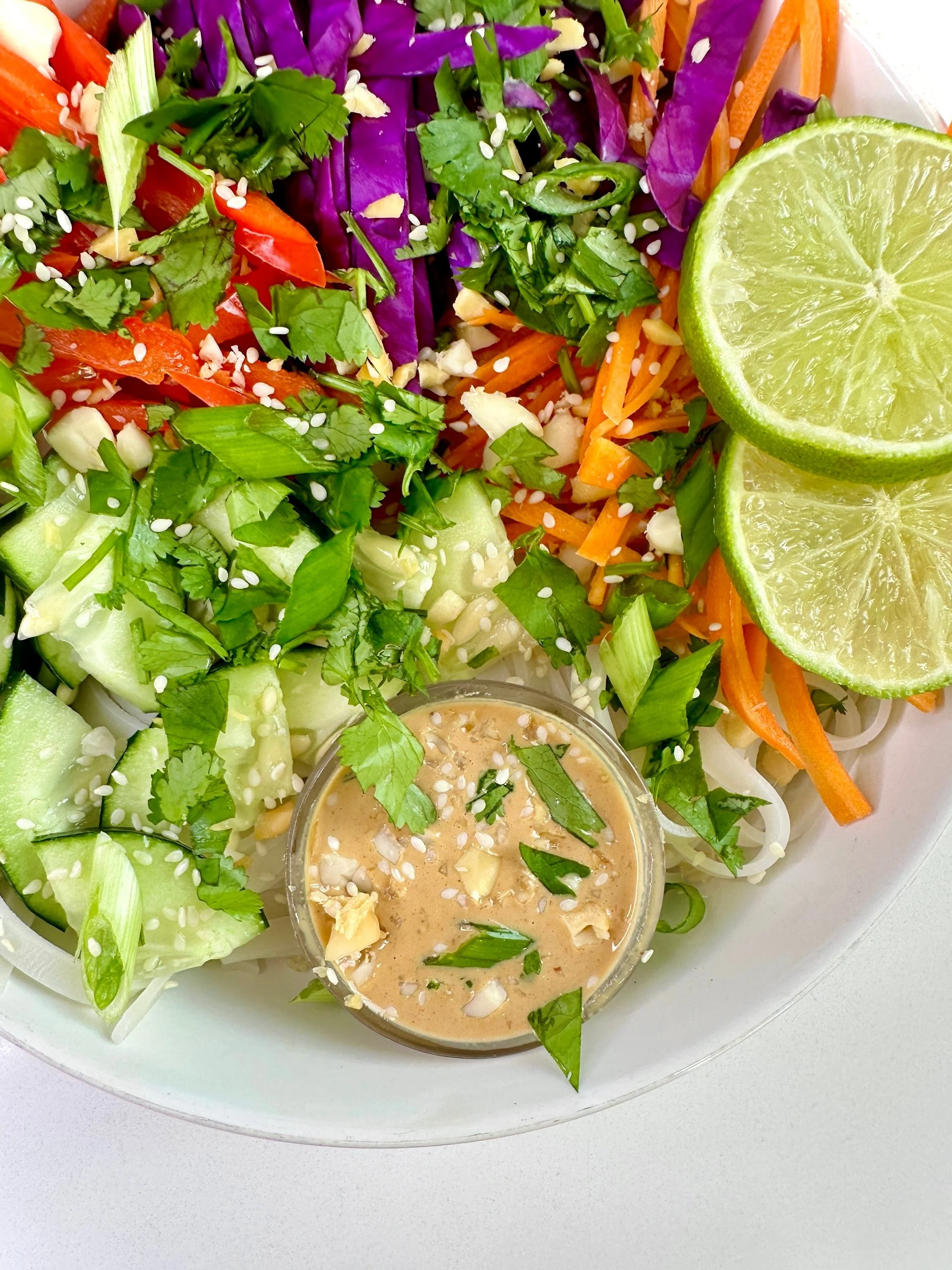 5. Drizzle the peanut sauce over the noodles and vegetables, then garnish with green onions, cilantro, peanuts, sesame seeds and lime slices. Alternatively, you can serve the peanut sauce in a bowl on the side, allowing individuals to opt for the amount of peanut sauce that they prefer.